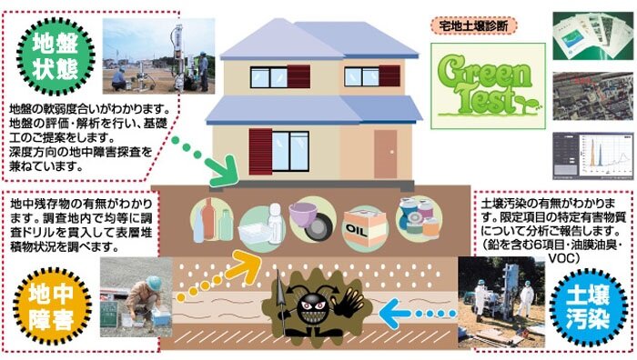 グリーンテストとは、家などを建てる際に問題となる軟弱地盤や地中障害物、土壌汚染などをまとめて調べるサービスで、いわば「土地の健康診断」です。